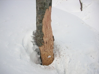 大抵の場合群れで行動するシカたちの獣道はとても立派で、これらの獣道は特別に『シカ道』と呼ばれます。雪の谷間に付けられたシカ道は、まるで僕たちのラッセル跡のようにしっかりと踏み固められ、まさか他の人に会うことの無いであろうと思える深い森の中で突然このシカ道に出逢うと、いつもビックリするのです。 シカ道を辿って行くと、シカたちの食事跡を見付けることができました。食料の少ない厳冬期、彼らはこのようにブナの皮などを食べて暮らしているようです。一方、皮を食べられたブナの方は災難でして、運が悪ければこのまま枯死してしまいます。それでも、ブナの森を守るためにシカを退治しなければ、なんて思ってはいけません。もしブナの木がこのまま倒れてしまったとしても、その場所にはその後新たに別のブナが芽生えて世代が交代され、森全体が老化することなく維持されると言う仕組みなのです。 健全な森の中では全ての生命がそれぞれ影響し合うことで森全体が持続され、無駄な出来事など何一つ無いのです。 |