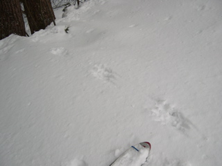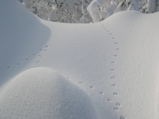 動物たちが森の中を移動する時にどういうルートを通るかはもちろんその動物の自由なのですが、多くの場合、より早く楽に移動できるルートが選ばれるようです。どうやらこの『早く、楽に』の感覚は全ての動物に共通するようでして、動物の種類に関係なく、ほぼ決まったルートが使われています。ルートは何頭もの動物の足で踏み固められて道となり、これらは『獣道』と呼ばれています。登山道の無いヤブ山でも、ここぞと言う尾根や谷には必ずと言っていいほど獣道が存在しまして、変な山登りばかりする僕達は、それらの獣道を利用させていただく事も多いのです。 これは岐阜県の飛越新道で見付けた、雪上にできた獣道の様子です。足あとをよく観察しますとウサギやリスなどの草食動物に混じって、その捕食者であるキツネやテンの足あとも見られます。森の動物たち皆が共同で利用している、まるで動物王国の国道1号線みたいですね。 |