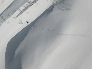 雪の斜面に一頭のカモシカくんを見つけました。このカモシカくんは大胆にも真っ白な急斜面の中央を横切ろうとしています。げげ、ホントに大丈夫なのかな。雪崩れが起きないかとヒヤヒヤしながら見ていましたが、そんな心配など何処吹く風、カモシカくんは全然気にせずスタスタと進み、何事も無かったように尾根の向こうへと消えて行ってしまいました。うーん、恐るべし。 真っ白な雪の斜面は見ていて大変美しいのですが、それは同時に雪崩れの多発地帯であることを示していまして、登山中にこのような場所が出てくると緊張します。彼には、自分が通ったくらいでは雪崩れないということが分かっていたのでしょうか。だとすると、さすが森の住人。ホントにすごい判断力ですね。 |