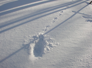 コウモリ以外の空を飛ぶ哺乳類は、日本にはムササビとモモンガが棲息しています。ムササビは別名『バンドリ(晩鳥)』とも呼ばれ体が大きく、飛ぶと座布団くらいの大きさがあり、里山近くで良く見かけます。一方モモンガはニホンリスよりもやや大きいかなという程度で目が大きく、なかなか可愛いらしい姿なのです。モモンガはムササビよりも山地が好きな様子で、僕の場合は冬の早朝登山の時などに、木々の合間を飛ぶその姿を時々見かけます。 この写真は福井県の経ヶ岳の登山中に撮影したナゾの足あとです。一見ニホンリスの足あとのように見えますが大きさがやや大きく何となくガニマタ風で、ニホンリスとはちょっと違うような気がします。一方、この周辺は植林と自然林の境界線になっていまして、ここでは複数のモモンガくんに出合う事が出来ました。そんなわけで、ヒョッとしたらこれはモモンガくんの足あとではあるまいかと思っているのですが、どうだろ? |