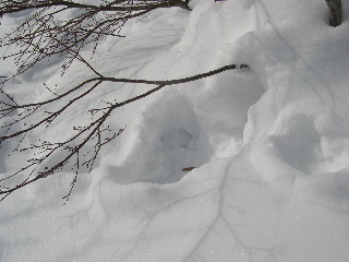 これはウサギが一休みしていた跡です。ウサギさんはこのように木の根元の雪が窪んだところで休憩することが多いようです。 |
