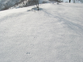 本州のウサギはノウサギで、北海道のウサギはユキウサギです。ユキウサギは本州のノウサギよりも一回り大きく立派です。どちらも雪山ではもっとも良く見かける足あとです。 ノウサギの場合、冬毛は普通は白ですが、たまに冬でも茶色いのも見かけます。初冬には耳と足だけ白くなった楽しいのも見かけます。けっこう臆病者でいつも耳をピンと立てて警戒しまくってますが、安心すると耳を寝かすそうな。そんな姿をぜひとも覗かせてほしいですね。 ちなみに小学校などで飼育されているウサギはアナウサギ(Oryctolagus cuniculus)でして、ノウサギとは属違いの全くの別種なのです。 |