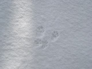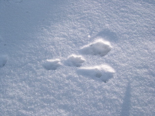足あとは、こんな感じ。ウサギよりも随分小さくて、鋭くめり込んでいる場合が多いようです。ちなみにトップページのバックの写真はニホンリスの足あとなのです。 |