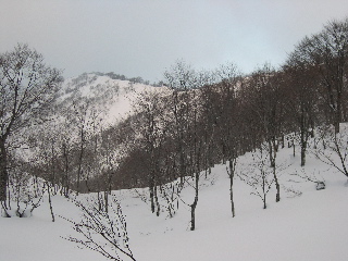 →滑降→推高谷1200mh(13:50)→野伏ヶ岳登り返し1300mh(14:28)