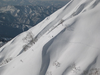 最初はクラストを割らないように慎重に行きましたが、谷底は吹きだまり。