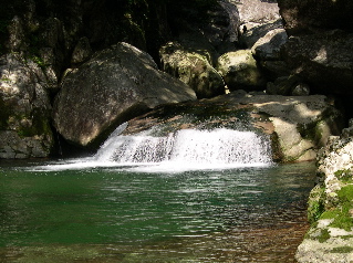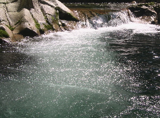 入渓点の吊り橋のすぐそばに、大きな岩の上を流れる、