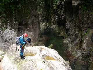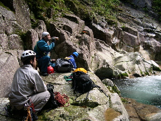 下降点はゴルジュの真ん中で、対岸の登りは不可能。