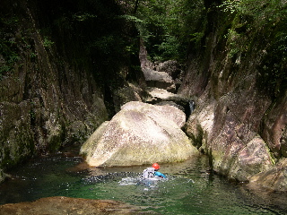 その先の最後のゴルジュを泳ぎきり、大きな岩を越えると、