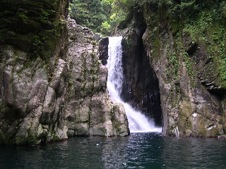 樋のような滝が淵の入口を塞いで、