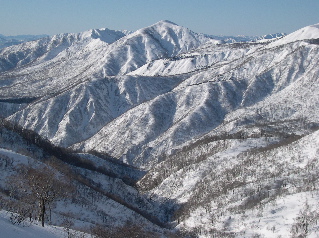 中央左が『よも太郎山1581mh』、右のピークが『願教寺山1690mh』。
