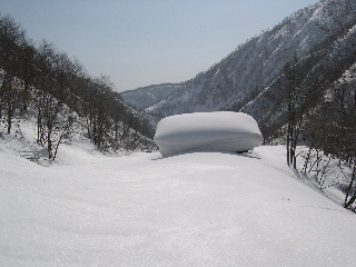 なんと、ガケからの雪が林道上に堆積して、
