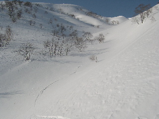 ここの左側斜面は、残雪期には底雪崩が頻発しますので、注意しましょう。