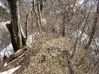 すごい急な尾根ですが、写真中央の部分を通れば何とか先に進めそうです。