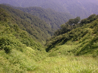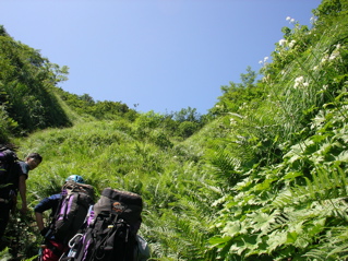 ここは左岸の、どうにも難儀な草付きボロ斜面を登ります。