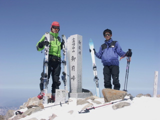 山頂の杭の前で2人並んで記念撮影。