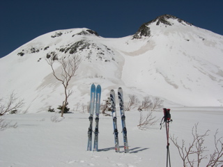 先生は斜面の途中で板を脱ぎ、そのままツボ足でスイスイ登られますが、