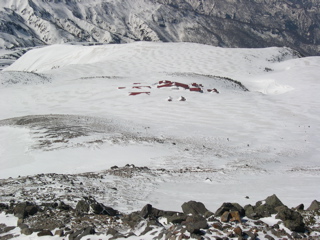 小さな岩にしがみ付きつつ、なんとかアイゼンを付けました。