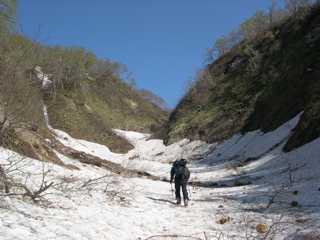 出合いからしばらくは全く雪は無く、ほとんど沢登り状態なのです。