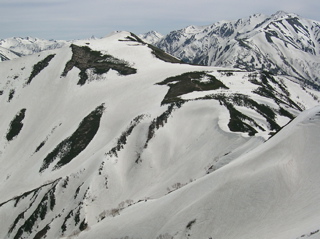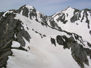 山頂付近から右へと続く大きな雪渓を下りてきました。