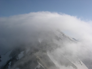 相変わらず周辺はガスに包まれ、雪がパラパラ降っていますが、