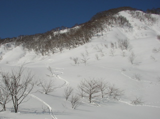 そこそこのパウダー斜面を三ツ谷780mh付近までイッキに滑り、