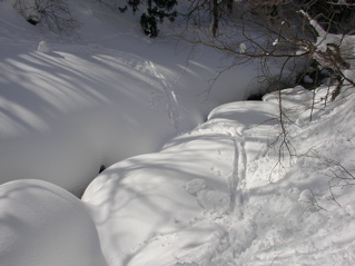 尾根を快適に滑り降り、850mh辺りまで来ますと、、、