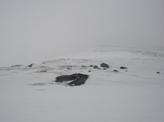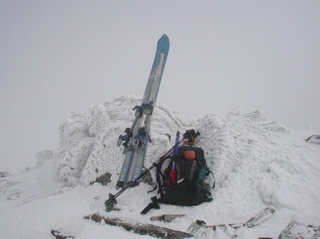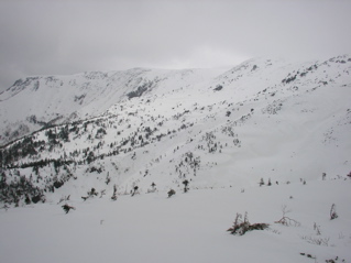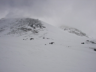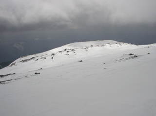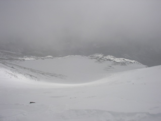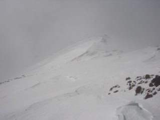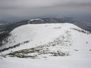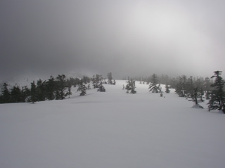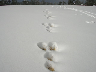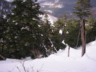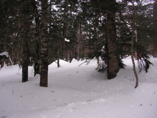 今回は丹生川の岩井谷集落から乗鞍岳を目指してみましょう。 今回のルートは、これまでと少し趣向を変えまして、 五色ヶ原からいきなり千町尾根に取り付くコースとしましょうか。 昨年の2回の山行は、何れも途中でヤブに阻まれ、 なかなか難儀な山行でしたが、 こちらのコースはどんな様子なんでしょ。楽しみですね。 ではでは、ハリキッて行ってみましょう。 今日も例によって超早起きで、 先ずは長い長い林道歩きからのスタートなのです。 でも今年は雪が少ないので、 なんとなんと、車のまま少し奥まで進むことができますぞ。 集落から300mくらい奥の、 路肩が少し広くなった部分に駐車させていただきましょうか。 寡雪のおかげで、ホンの少しだけ楽できましたね。 駐車スペースのすぐ側から、元気よくシールでスタートします。 でもしばらく進むと、林道の雪は所々で切れていまして、 その度に、土の上をスキーのままでソロリソロリと歩きます。 周辺の雪量は、昨年の最後の山行よりもさらに少ない様子です。 でも林道ショートカットには十分な雪の量で、 その点、ホッと一息なのです。 始めはいつものように調子よくスタスタと進むのですが、 だんだんと、何となく胃の辺りが重たい感じになってきました。 睡眠不足の影響でしょうか、 あるいは昨晩食べ過ぎたギョウザがいけないのでしょうか、 なにやら体調が悪化してきたようですぞ。 歩くペースがどんどんと遅くなってきています。 そう言えば前回ここに来た時も同じように辛い思いをしたような気がしますし、 この林道、僕とちょっと相性が悪いのかな? ま、でも例によって今回も気楽な単独行ですので、 行くも戻るも自分次第。 マイペースでボチボチと進みましょう。 さ、そろそろ五色ヶ原の橋が見えてきましたぞ。(4:33) 今回のルートはこの林道をさらにそのまま奥へと進み、 広い谷を大きく左に渡る辺りから、 そのまま稜線まで詰めてしまおうと言う作戦です。 千町ヶ原の北面は、どこも似たような急斜面になっていまして、 それでも、ルートを上手く選べば登る事は可能でしょう。 そんなわけで、気合いを入れて、レッツゴー。 今日は気温がめちゃめちゃ高く、雪は水分を多く含んだネバネバ状態。 もし雪合戦をするのならば、雪玉の作りやすい最適な雪質なのですが、 シール歩行にはちょっと辛いです。 シールの下に下駄のように雪が付着し、 油断すると滑ってバランスを崩しそうなのです。 急斜面ゆえにここでの転倒は許されませんので、 一歩一歩慎重に進みます。 適当なところで雪質チェック。 ねばねばクサレ雪の下はザラメ状態で、 上下の接合状態も良く、特に危険な弱層は無い様子。 本当なら早めに支尾根に出たいのですが、 この状態ならそのまま谷を詰めても大丈夫でしょう。 そんなわけで、尾根を目指してレッツゴーなのです。 途中、10mほどのスキーで登れない雪壁があり、 ここだけは木登りのような格好でクリアしまして、 それを越えると、急傾斜もやや納まり、 ようやく尾根に上がれたようですぞ。 ふぅ。(7:35) 尾根の様子(2060mh 7:35)周辺の様子はこんな様子。 シラビソとコメツガ主体の、針葉樹の森なのです。 しかも、ほら、見てくださいよ。 かなりの疎林で、恐れていたヤブヤブは全く見当たらず、 とっても平和な様子じゃないですか。 そんなわけで、これはヒョッとして、ヒョッとすると、 今度こそ正真正銘の『ルンルン稜線散歩』が楽しめるのかもしれませんぞ。 ふふふ。これは期待大ですね。 では、そろそろ行きますか。 ところで、実は今日は朝からスッキリ快晴の予定だったのですが、 空を見上げれば何故だかドンヨリとした曇り空。 しかも時折小雨もパラつく、全く冴えない天気なのです。 周辺の視界はあるものの、 残念ながら、遠くまで見渡すことは出来ません。 んんー、これは辛いなぁ。。。 時折ガスに包まれながらも、トボトボと進みますと、 奥千町の避難小屋が見えてきました。(9:31) 小屋の様子が気になるところですが、 今回の目的地はまだまだ遠いので、 帰りに時間があれば訪問することとしましょう。 さらにしばらく進みますと、 お!日差しが、、、 貴重な日差し(2360mh 9:34)今日始めてのお日様の光が、雪面に届きました。 天気は少しずつ回復に向かっているのかもしれません。 早めの回復に期待ですね。 稜線上には動物達の足あとがたくさん残されていまして、 途中、こんな足あとを発見しましたよ。 ヨゴれた足跡(2360mh 9:40)これはウサギさんの足あとなのですが、 何やら木の皮やら落ち葉やらが詰まっていて、 かなり汚れた様子ですね。 ヒョッとして、泥足で雪面を駈け抜けたのかな? 実はこれ、足あとの穴ボコの中に、 風で運ばれてきたゴミが溜まったのが原因でして、 別にウサギさんの足が汚れていたわけでは無いようです。 ウサギさん疑ってゴメンネ。 天気はさらに回復してきまして、 かなり遠方まで見渡せられるようになりました。 千町尾根を見