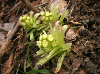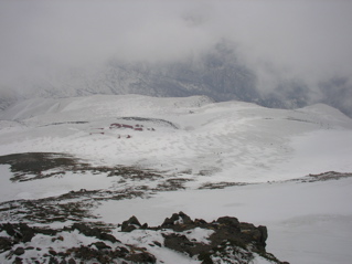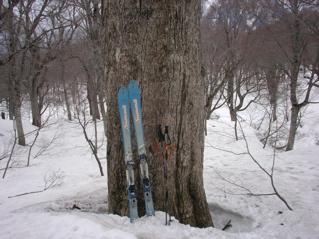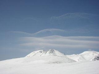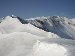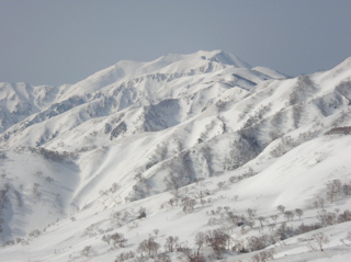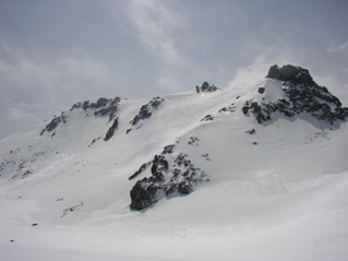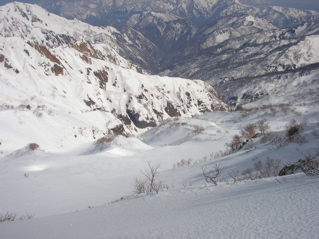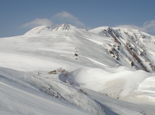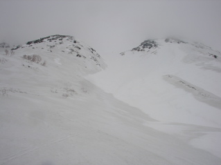 今回は久しぶりに白山に出掛けてみましょう。 4月に入って雪解けもすっかり進み、 大白川林道もそろそろと自転車通行が可能な頃かと思われます。 そんなわけで今回は、間名古谷を利用して稜線に上がり、 稜線添いに白山を目指すこととしましょう。 例によってアプローチが少し長めですので、 超早起きで気合いを入れて、 さぁハリキッて行ってみましょう。 真っ暗闇の中、先ずは自転車に乗ってのスタートです。 林道上には雪は全く無く、何となく不安な雰囲気が漂う中、 キコキコと自転車を漕ぎます。 2つめのトンネル手前でデブリが林道を塞いでおり、 除雪作業もどうやらここまでの様子です。 ヒョッとするとまたしてもトンネル出口が雪で覆われているのかと思いきや、 トンネル出口には予想外に全く雪が無く、 この時期に、このような状況は過去初めてのことなのです。 今シーズンの寡雪を象徴しているなと思えます。 さ、そろそろ間名古谷の橋に到着ですぞ。(3:00) ここで自転車をデポします。 間名古谷へと続く林道は、雪に覆われているようですが、 とりあえず不安なので板を担いだまま進みます。 でも雪はかなりしっかりと積もっていまして、 最初の橋を渡った先からシール歩行としましょう。 この林道、部分的に森と一体化し不明瞭な部分もありますが、 特に問題もなく進みます。 1280mh付近の、林道が谷の左岸に渡る手前で林道とお別れし、 右岸添いにルートを取ります。 沢からは相変わらず沢音が元気良く聞こえていまして、 ヒョッとしたらこの先通過に相当手こずるかもと、 いよいよ心配になり始める頃、 1400mh付近でようやく音も静まり、 とりあえずホッと安心なのです。 心配していたデブリ地帯は夜明け前に無事通過し、 1700mhの二俣を左へと進みます。 そろそろ周辺が明るくなってきました。 急斜面を大急ぎで登り切れば、 ようやく安全地帯のウグイス平に到着です。 振り返ると朝日が美しく輝いています。 美しい夜明け(1900mh 5:51)遠くに見えているのは奥三方岳のシルエットです。 ホントに美しい風景ですね。 ウグイス平はオオシラビソの点在する針葉樹の森で、 周辺は急斜面もなくノンビリとした様子ですので、 このまま白山に向かってトラバースで進もうとしますと、 んん? 鳥の足あと(1950mh 6:12)なんとなんと、雪面に鳥の足あとを発見しましたぞ。 初めはライチョウさんの足あとかと思えましたが、 やや細身な様子で、ヒョッとしたらヤマドリさんかな。 そんなわけでとっても気になるので、 このまま足あとを追いかけてみることにしましょう。 足あとは真っ直ぐ稜線に向かっていまして、 途中何度も飛び立ちそうになるものの、 そのまま飛ばずにさらにテクテクと続いています。 どうやら彼は歩くのが大好きなようですね。 右側には間名古の頭が見えています。 マナコのカシラ(1950mh 6:19)なだらかな丘のような稜線が、 何となく海の生物が横たわっているように見えなくもありませんが、 ちょっと考えすぎかな。 足あとは稜線手前で間名古谷側へと下っており、 さすがにこれ以上は付いて行けません。 それにしても、彼はいったい何処まで歩いていったのでしょう。 その様子を想像すると楽しいですね。 さて、気を取り直して稜線を進みましょう。 すぐ前にある2114mhピークに登りますと、 おぉー!! 遠くに白山(2110mh 6:37)目の前にとても立派な白山がドドーンと鎮座されていました。 これはホントの本気で素晴らしい風景なのです、 やはり来て良かった、あぁ感動。 2168mh付近は稜線がやや細くなっていますが、 それほど難儀ではありません。 稜線の様子(2150mh 7:22)白山の大パノラマを楽しみながらトボトボと進みますと、 周辺はいつしか真っ白けの台地へと変わります。 ここは北弥陀ヶ原と呼ばれる雲上の別天地なのです。 北弥陀ケ原と白山(2180mh 7:42)台地の左端に寄り道しますと、 眼下には東面台地の風景が広がっています。 ここからだと東面台地の様子が手を取るように分かりますね。 遠くには別山が白く輝いています。 東面台地の向こうに別山(2180mh 8:13)近いうちにご挨拶に行ってみたいものです。 ところで、白山の様子をよく見ますと、 上空には何やら傘雲のような不吉な雲が現れていまして、 さらによく見ると、その形が激しく変化しており、 上空の気流はかなり不安定な様子です。 怪しい雲(2300mh 8:42)何となくイヤな予感が。。。 2349mhから先は標高をやや下げ、 この先の稜線添いはやや痩せていますので、 ここで稜線を離れ、 翠ヶ池へと続く浅い谷を直登することとします。 剣ヶ峰北面の様子(2300mh 9:10)剣ヶ峰北面の様子はこんな様子。 上の写真の左端が剣ヶ峰で、 その右側にある鞍部を目指します。 稜線を下ると、そこからは北側の仙人谷が立派です。 仙人谷を見下ろす(2270mh 9:12)仙人谷は北側に開けた大きな谷でして、 今すぐ滑るととっても気持ちよさそうな様子です。 でもその代わりに登り返しが大変そうですね。 またいつか滑ってみること
