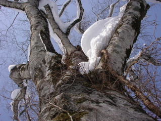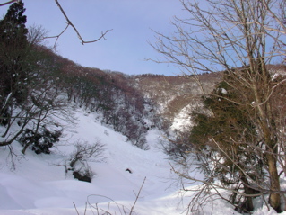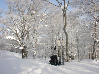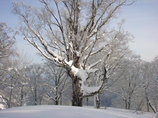 今年の冬は思ったほどに雪が積もらず、 なかなか山に出掛けることができません。 それでも、いくら何でも、 もうそろそろと大丈夫でしょう、っと言うことで、 今回は飛越国境の大高山に出掛けてみることにしましょう。 大高山は国境稜線から少し離れた中途半端な位置にあるため、 登山者の間ではそんなに有名な山とは言えませんが、 自然愛好家の中では豊かなブナ林の山としてなかなか名の知れた存在なのです。 さ、では今回もハリキッて行ってみましょう。 先ずは猪谷集落からR360を少し奥へと進んだ、 路肩のスペースに愛車を駐車します。 この周辺、人里が近いこともあって、 なかなか適当な入山ポイントが無いのですが、 ここなら大丈夫。 擁壁のスキマから板を手に持ちツボ足でスタートなのです。 少し登るとすぐに上部の林道に出まして、 ここで板を履き、杉の植林へと進みます。 雪は比較的豊富で一安心。 それに最近はあまり新雪が積もっていないようで、 ラッセルも靴程度で楽勝なのです。 今シーズンは少しサボり気味で完璧な運動不足状態。 体力面でたいへん不安を抱えての入山でしたが、 とりあえずホッと一息なのです。 杉植林はいつしか終わり、 周辺が細ブナの森に変わりつつあるころ、 そろそろと夜明けのようですね。 キラキラ夜明け(750mh 7:21)おはようございます。 今日も一日ヨロシクね。 尾根は特に難所もなく、 動物たちの足あとや、森の様子を楽しみつつ、 トボトボと登ります。 さ、そろそろと大高山の山頂ですぞ、 やったー、ピークだ。バンザーイ。 大高山の山頂(1100mh 8:15)山頂の様子はこんな様子。 木のずいぶんと高い所に手作りの山頂看板がくくり付けられていますが、 何であんなに高いところにあるのかな。 これってヒョッとすると今年の雪が、 あまりにも少ないと言うことを物語っているのかな。 んんー。。。 さて、少し休憩したら、 ここから先はお楽しみのルンルン稜線散歩が始まります。 周辺はウワサ通りの素晴らしいブナ林が広がっています。 豊かな森(1090mh 8:28)うんうん。これは立派な木ですね。 ホントに素晴らしい風景なのです。 少し進むと、唐掘山方面を眺めることが出来ました。 唐堀山方面の様子(1080mh 8:38)次の目的地へは、何だかまだまだ遠いようですね。 ホントに今日中に行けるのかな。 ところで、手前に見えているクリスマスツリーのような木々は、 いつものシラビソくんではなく、 なんとなんと杉植林なのです。 稜線北側には豊かなブナ林が広がっていると言うのに、 このように南側は憎っくき杉植林地帯となっていまして、 以前ならこちら側にもきっと素晴らしいブナ林が続いていたのだろうと思うと、 とっても残念なのです。 でも、憎っくき杉植林なんて言いつつも、 元を正せば我々人間が勝手に杉ばかり植えるからこのような様子になったのであって、 杉の皆様の立場としましては、 『憎っくき』なんて言われる筋合いは何処にもないのです。 最近は花粉症の原因などで嫌われがちの杉の木たちが、 ちょっと寂しそうにしている姿がそこに見えました。 杉の木だって、このとってもキビシイ環境に根を張り、生活をしているのだから、 立派な森の一員なのだと言うことを、 今さらながら気付かされたのです。 今ここではただの闖入者でしかない僕なのに、 身勝手極まりない下品な言葉で呼んでしまって、 ホントに申し訳ない。許してね。 さてこの稜線、ウワサ通りの素晴らしいブナの森なのです。 幹周り3.5m級のブナが至る所に林立し、 中には4m級の巨木もチラホラと見えます。 これだけのブナの森はかなり貴重な存在だなと思えます。 大きな木にご挨拶をしつつ、 登ったり下ったり、 フラフラと移動するのでなかなか先に進めませんね。 しばらく進むと、少し下った所に、 ひときわ大きなブナの木を発見しましたぞ。 メチャメチャ大きな木の根元(1080mh 9:31)どうです、スゴイでしょ。 描写がヘタクソなので雰囲気が上手く伝わりませんが、 これはホントの本気でめちゃめちゃ大きな木なのです。 半分雪に埋まってしまって幹周りの計測はできませんでしたが、 パッと見た目に4mは軽くクリアしており、 おそらく4.5mはあろうと思える超巨木なのです。 こんなに素晴らしい巨木様に出会えるなんて、 素晴らしすぎで、感動しまくりなのです。 メチャメチャ大きな木の枝振り(1080mh 9:34)同じ木を見上げてみるとこんな感じ。 何事にも動じることのない力強さが溢れ出ています。 更に先を見てみますと・・・ 巨木がバンバン(1080mh 9:38)上の方にも4m級の巨木がバンバンと並んでいるじゃないですか。 全くホントに、ここはまるで異次元の世界なのです。 もし僕がその筋の役人ならば、 即刻この場所を天然記念物に指定することでしょう。 ホントの本気で素晴らしい。 僕は先ほどからもうずっとシビレっ放しなのです。 やはり来て良かった、あぁ感動。 僕達はこの貴重な森を、 いつまでも大切にしなければいけないのです。 