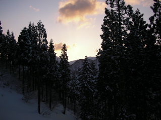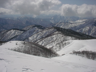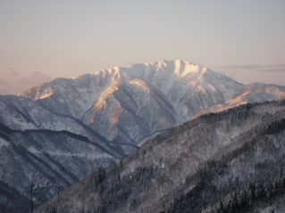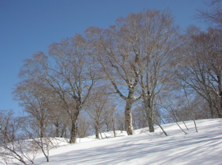 今回は奥越の赤うさぎ山に出掛けてみましょう。 赤うさぎ山はとってもかわいい名前の山なのですが、 厳冬期には周囲を深い雪に閉ざされ、 その名前とはウラハラに、なかなか近寄り難い、 かなり難儀な山なのです。 今回は南側に伸びる尾根経由で挑戦してみましょうか。 ではでは、ハリキッて行ってみましょう。 下打波発電所に掛かる橋の手前で道路の除雪は終了です。 道路の端っこに車を駐車させていただき、 先ずは林道歩きからスタートです。 先ほどまで降り続いていた雪はようやく上がり、 スッキリとした星空を眺めつつトボトボと進みます。 今回は降雪直後ゆえ厳しいラッセルが予想されましたが、 新雪の量はそれほどではなくホッと安心。 しばらく進むと、右下に上打波発電所が見えてきました。 この発電所、夜中と言うのに皓々と灯りが輝いていまして、 防犯の意味もあるのだと思えますが、 見るからに何とも勿体ない様子で、 とっても貧乏性の僕としましては、 今すぐにでもスイッチを切りに行きたい気分です。 更に進むと、ようやく上打波集落に到着なのです。(5:45) この集落、冬期は無人となり今は静かな様子です。 ところが何やらいくつもの街灯が周辺を明るく照らしていまして、 んんー、困った。。。 そんなわけでこの周辺、 貧乏性の方々には、とっても辛い道程なのです。 橋を渡った左側に神社がありますので、 村の神様にご挨拶を済ませたら、 せっかくですのでこのまま入山させていただきましょう。 神社の裏は杉植林斜面へと続いています。 途中、2回ほど林道に近付きますが、 林道は利用せず尾根をそのまま進みますと、 そろそろと周辺が明るくなってきました。 植林地帯の夜明け(750mh 6:49)天気予報通り、今日はスッキリ快晴のようですね。 雪の量は期待していたよりもずっと少ないようですが、 幸いヤブヤブは邪魔にならない程度に隠されていまして、 特に難所も無く、順調に標高を上げます。 振り返りますと、、、 朝日に輝く荒島岳(800mh 7:00)おぉー、あれは荒島岳じゃないですか。 実に堂々とした姿なのです。 また近いうちに出掛けてみたいですね。 さて、そろそろと「しようつ山」に近付いてきたようです。 杉植林はいつしか終わり、 周辺はミズナラ主体の二次林へと変わってきました。 雑木の森(1000mh 7:43)昨日までの吹雪が収まり、 小鳥たちも久しぶりの晴れ間で大喜びの様子。 あちこちから美しい歌声が聞こえてきます。 さっそく双眼鏡を取り出しまして、 うほほ〜、よく見えますね。 でもこうなると、野鳥観察がメインになって、 なかなか歩みが進みませんねぇ。 樹種の豊富な雑木林を抜けると、 いよいよ本命のブナがチラホラと見えてきました。 ブナの森(1100mh 8:26)まだまだ細ブナ主体の若い森ですが、 なかなか健康的な、力強さを感じさせる林相で、 今後に期待なのです。 尾根は再び杉植林地帯へと入り、 その先の小高くなった丘に登ると、 ようやく前方の展望が得られました。 途中のピーク(1320mh 9:40)目の前に見える小さなピークは地形図上の1351mh標高点で、 ホントならこのピークには登らず、左側をトラバースする予定でしたが、 よく見ると、付近には豊かなブナ林が広がっているようです。 これはもうやはり行ってみるしかないでしょう。 っと言うわけで寄り道決定なのです。 経ヶ岳の様子(1320mh 9:47)左側には経ヶ岳の姿が美しいです。 この山、スキーでは反対側から登られる事が多いようですが、 こちら側の尾根はなかなか厳しい雪稜になっているようで、 スキーでの登山はちょっと難しそうなのです。 そろそろと先ほど見えていたブナ林へと入ります。 周辺はやはりこの尾根一番の素晴らしいブナ林となっており、 3.5m級の太ブナもチラホラと見えます。 豊かな森(1340mh 10:04)うんうん、素晴らしい。あぁ感動。 やっぱり寄り道して良かったですね。 大きなブナにご挨拶しながら進みますと、 間もなく1351mhピークに到着です。 ここでようやく本日の目的地、赤うさぎ山の姿が見えました。 遠くに赤うさぎ山(1350mh 10:21)山名の通り、とってもノンビリとした、穏やかな山様なのです。 それにしても、まだまだ遠いみたいですね。 さ、頑張らないと。 ピークの先は少しだけ下りですが面倒なのでシールのまま下ります。 ここからもカラ類の歌声やキツツキさんの姿を楽しみながらの、 ルンルン稜線散歩が続きます。 細ブナの森を抜けると、急に視界が広がり、 ようやく頂上が目の前ですぞ。 もうすぐ頂上(1490mh 11:17)うほほー、これはなかなか素晴らしい風景じゃないですか。 雲上の別天地のような素晴らしい風景を楽しみながら進みますと、 さぁようやく山頂ですぞ。 やったー、ピークだ。バンザーイ!(11:39) なだらかな丘のような頂上からは、 周辺の山々がよく見えます。 石徹白の山々や大好きな別山。そして白山などなど、 ホントに素晴らしい風景なのです。 別山へと続く尾根(1628mh 11:46)三の峰から別山へと続く長い長い尾根が見え
